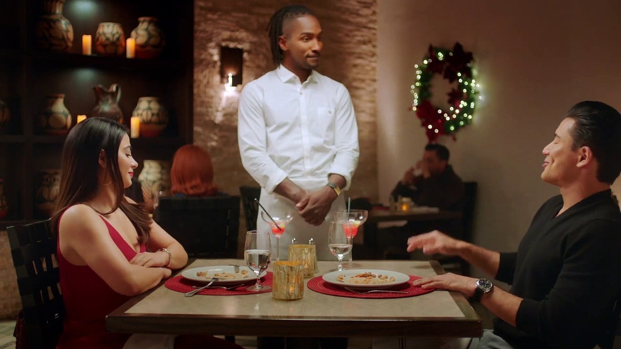 One of the weird things about this movie is that it is a commercial for Santa Fe that doesn't include anything real about Santa Fe. As I mentioned, Tony takes Belinda to a festival that doesn't exist to do a ham toss which also doesn't exist. There are many famous and delicious restaurants in Santa Fe, but Tony takes Belinda to a place called Lupita's that--you guessed it--doesn't exist. Why not have them actually go to an actual famous restaurant in actual Santa Fe? Mario Lopez also says "green chile" and "mole" with the emphasis of someone who has never said either of those words aloud. Emeraude Toubia, on the other hand, takes the opportunity to roll her r's every time a vaguely Hispanic word comes out of her mouth. The only person who seems comfortable blending the language is Tony's father, Efrain Figueroa, who says things like "Ho, ho, Jose!" and "On Dancer, on Blitzen, on Manuelito!"