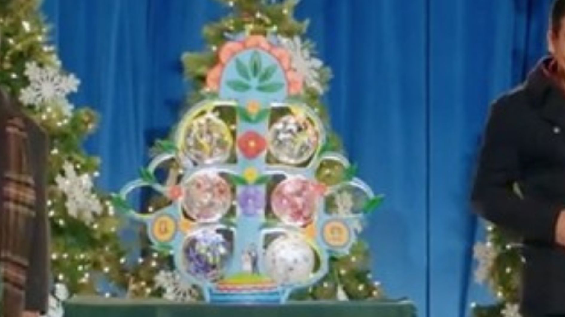 But the weirdest thing by far about this movie is Maggie's art. Maggie is suffering artist's block after her mother's death, and can't handle the pressure of the whole business on her shoulders. Her plotline takes over the last third of the movie, after all the juice has been squeezed out of Tony and Belinda's relationship. Maggie's mother made milagros, which, to be clear, are carved and painted pieces of wood that have a bunch of little silver charms nailed into them. You can find them all over the southwest; they were not invented or designed by the Ortega family. Yet, the whole Christmas/art world waits with baited breath for the release of the Ortega milago each year. This year, Maggie is struggling to come up with a design until Belinda convinces her that she should incorporate her blown glass ornaments into the milagro. Oh yeah, the Ortegas have a full commercial glass-blowing operation, complete with 1200℉ furnaces and molten glass, in the back of their tiny Christmas ornament shop, don't worry about it. Anyway, Maggie goes into an artistic frenzy and creates one of the ugliest pieces of art I've ever seen.